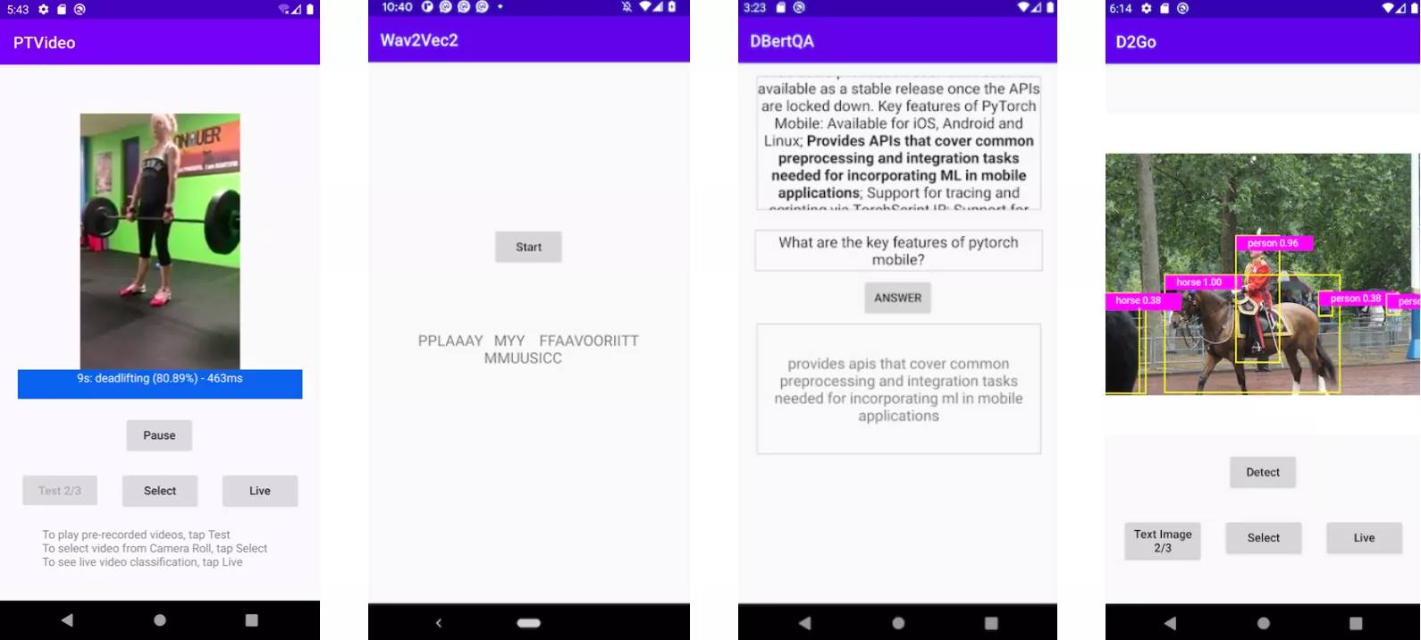 We are releasing a new video app based on PyTorch Video library and an updated speech recognition app based on the latest torchaudio, wave2vec model. Both are available on iOS and Android. In addition, we have updated the seven Computer Vision and three Natural Language Processing demo apps, including the HuggingFace DistilBERT, and the DeiT vision transformer models, with PyTorch Mobile v1.9. With the addition of these two apps, we now offer a full suite of demo apps covering image, text, audio, and video. To get started check out our iOS demo apps and Android demo apps.