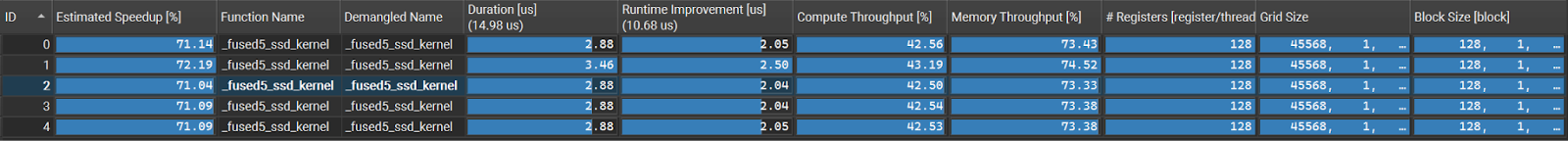 In this section, we analyze the bottlenecks in the optimized fused SSD kernel using Nsight Compute to examine the final utilization, stall patterns, and resource tradeoffs.