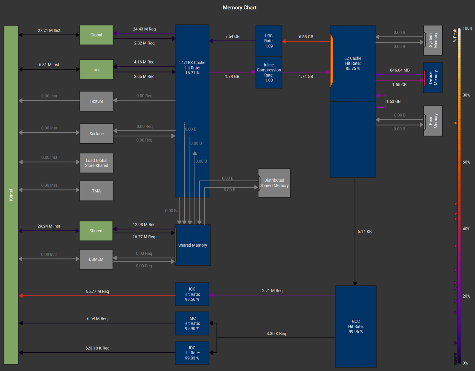 This memory chart suggests that, apart from the suboptimal memory utilization, the kernel is effectively L2-bound rather than DRAM-bound. Further optimization would therefore require either (1) increasing memory utilization, (2) tuning the block sizes / config, or (3) making radical algorithmic changes.