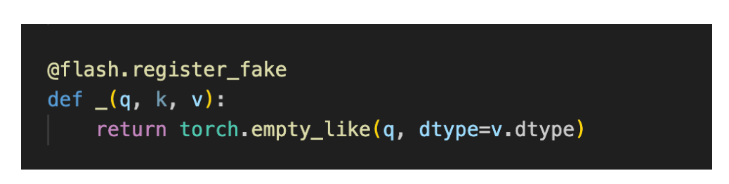 - Add a FakeTensor Kernel to the operator, which given the shapes of the input tensors of flash (q, k and v) provides a way to compute the output shape of the flash kernel