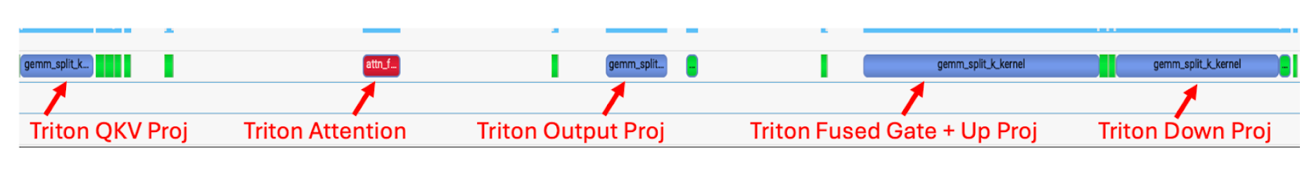 Torch.compile generates Triton kernels automatically for RMSNorm, RoPE, SiLU and Element Wise Multiplication. Using tools like Nsight Systems we can observe these generated kernels; they appear as tiny dark green kernels in-between the matrix multiplications and attention.