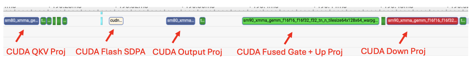 Figure 3. Trace of Llama3-8B with torch.compile, showing CUDA kernels being used for matrix multiplications and flash attention