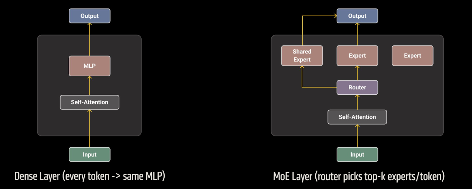 These economics let MoE models climb into the hundreds-of-billions-parameter range while training at dense-model speeds. DeepSeek-v3 and Llama 4 illustrate the payoff, blending MoE and dense layers to balance capacity, accuracy, and efficiency on today’s hardware.