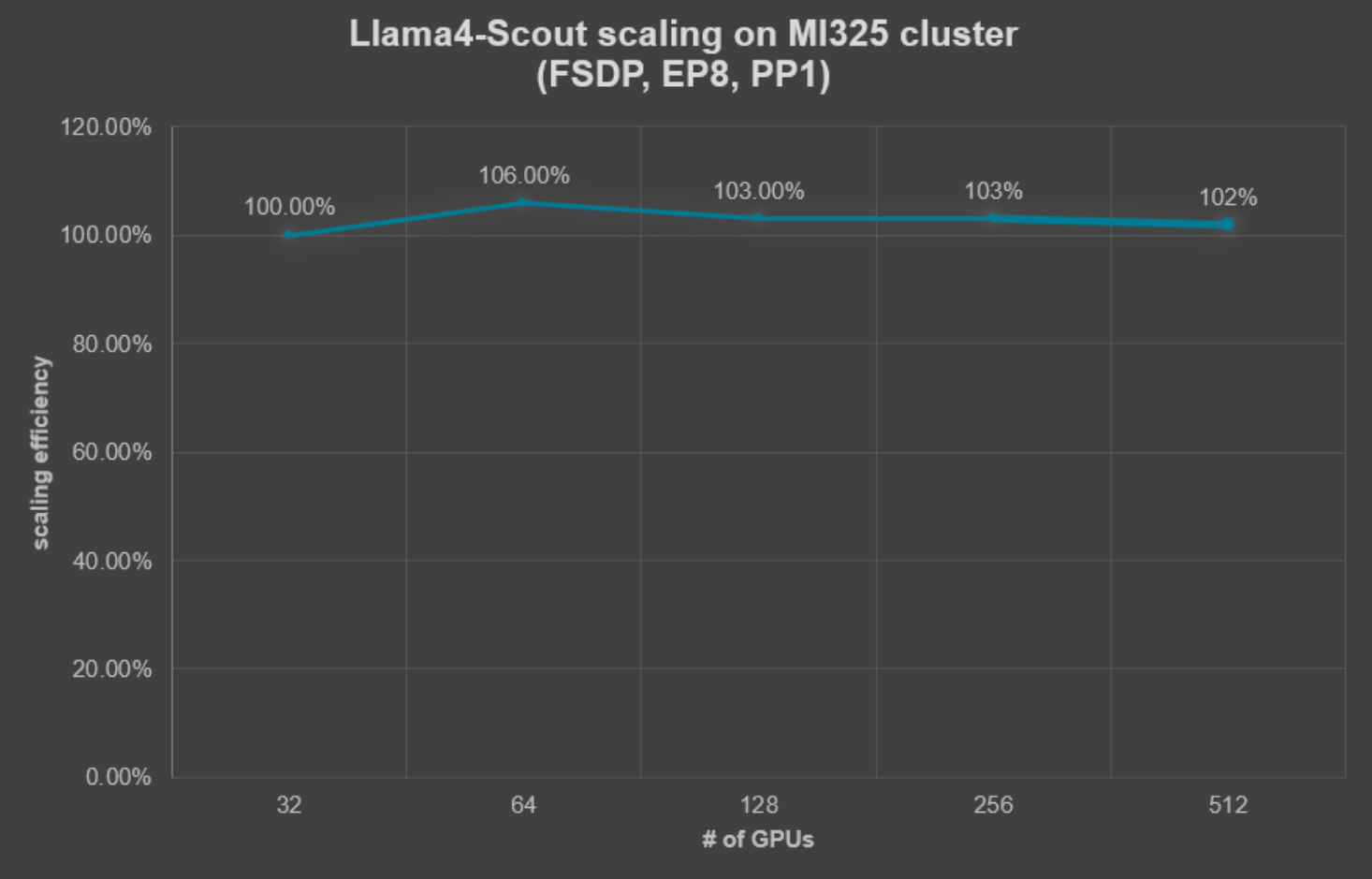 Our joint work with Meta shows that AMD Instinct MI325X hardware, combined with TorchTitan and the open-source Primus-Turbo library, delivers production-ready throughput for modern pre-training MoE models. DeepSeek-V3 reached more than 96 percent scaling efficiency up to 1024 GPUs; Llama-4 Scout displayed even higher linear scaling efficiency. Kernel-level tuning—FP8 GEMM, grouped GEMM, and Aiter attention—raised end-to-end performance by 2.77×, and all our implementation is open-sourced.