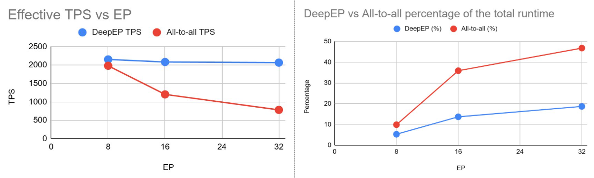 In the above experiments, we applied EP=8 because increasing the degree of expert parallelism make the All-to-All communication step prohibitively expensive. To mitigate this effect when scaling up the EP degree, Primus-Turbo also provides DeepEP to accelerate All-to-All performance. The charts below compare a standard All-to-All implementation (red) with DeepEP (blue) on a 16-node MI325X cluster training DeepSeek-V3 671B (24 layers, PP 4 + VPP 3, local batch 16). As the expert-parallel degree (EP) rises from 8 to 32, plain All-to-All throughput sinks from roughly 2000 TPS to about 750 TPS and its share of total runtime balloons from 10% to nearly 50%. DeepEP holds throughput steady around 2000–2100 TPS and total runtime for communication caps at ~18% even at EP 32, turning the scalability curve flat.