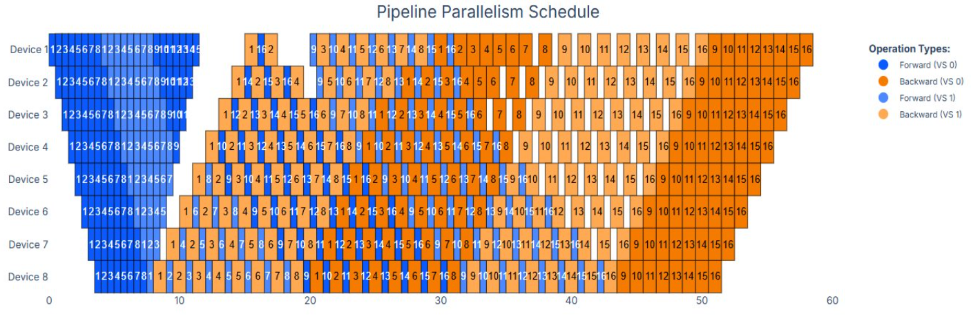 Figure 3: PP Schedule—the blue/orange heat-map showing how VPP overlaps forward/backward passes