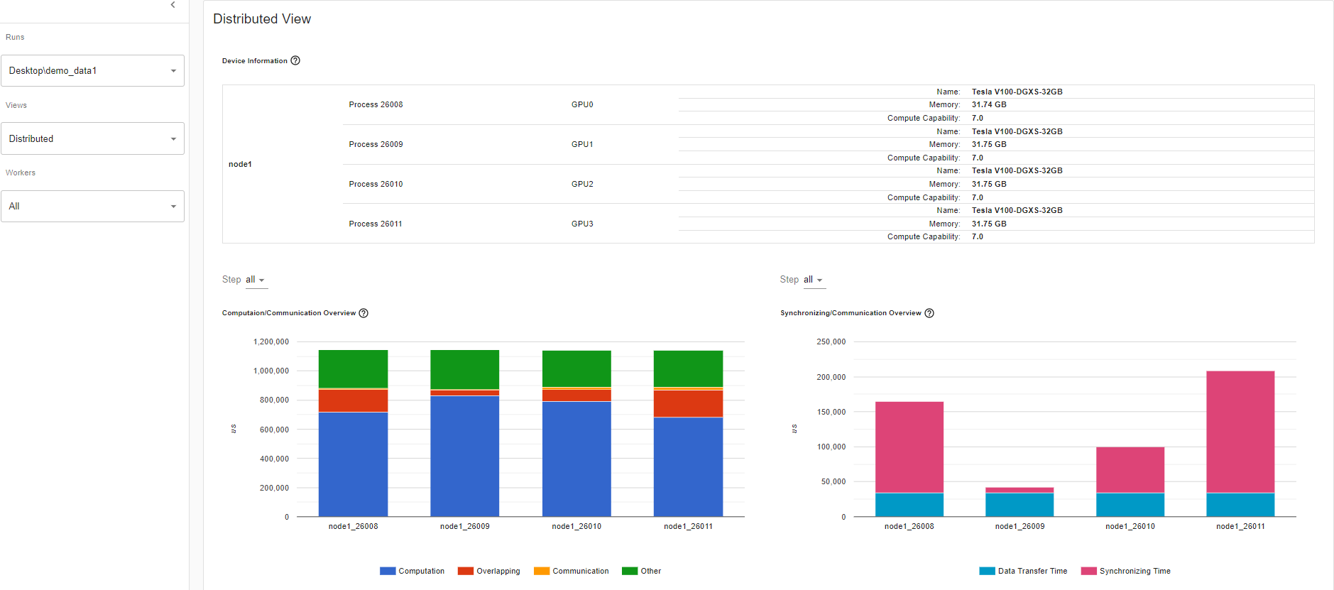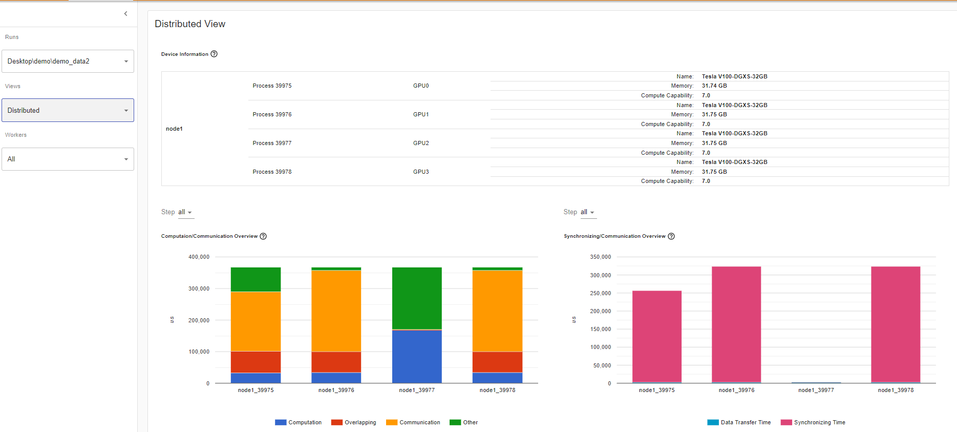 This feature will help you debug performance issues when one or more GPU are underutilized. Ideally, your program should have high GPU utilization (aiming for 100% GPU utilization), minimal CPU to GPU communication, and no overhead.