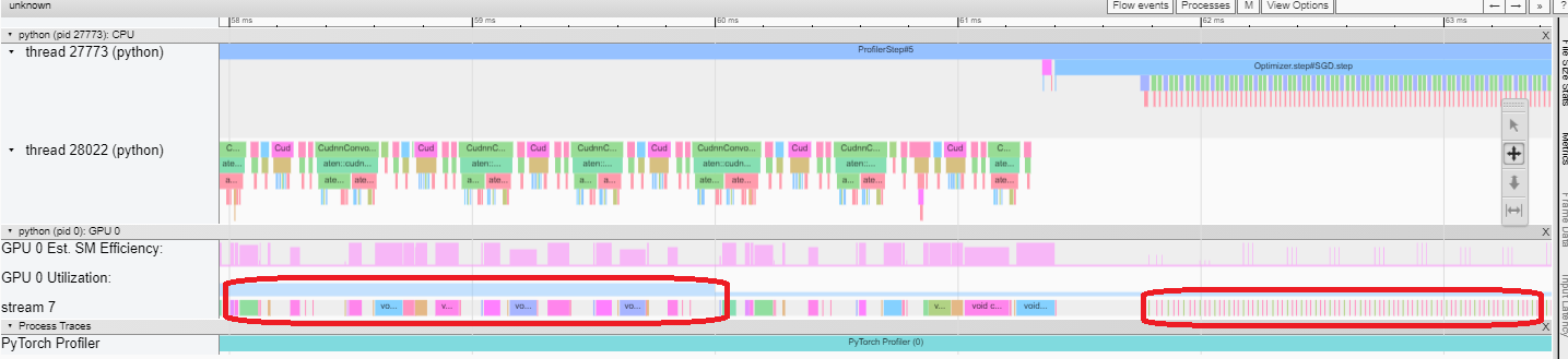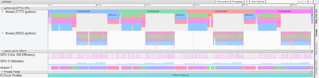 GPU utilization is calculated independently and divided into multiple 10 millisecond buckets. The buckets’ GPU utilization values are drawn alongside the timeline between 0 – 100%. In the above example, the “ProfilerStep5” GPU utilization during thread 28022’s busy time is higher than the following the one during “Optimizer.step”. This is where you can zoom-in to investigate why that is.