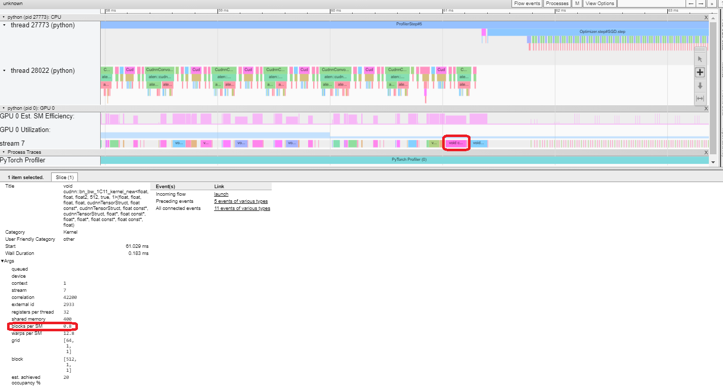 Est. SM Efficiency: Each kernel has a calculated est. SM efficiency between 0 – 100%. For example, the below kernel has only 64 blocks, while the SMs in this GPU is 80. Then its “Est. SM Efficiency” is 64/80, which is 0.8.