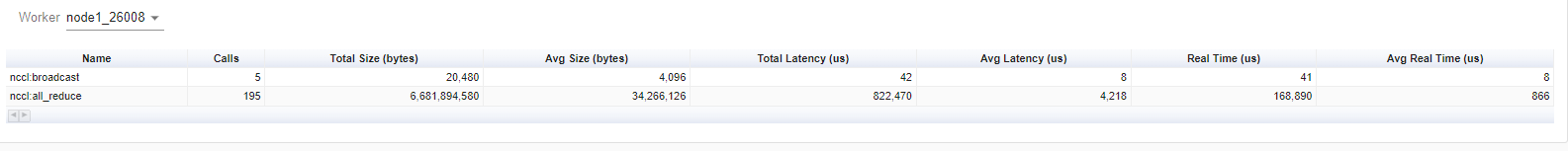This table view above allows you to see the detailed statistics of all communication ops in each node. This allows you to see what operation types are being called, how many times each op is called, what is the size of the data being transferred by each op, etc.