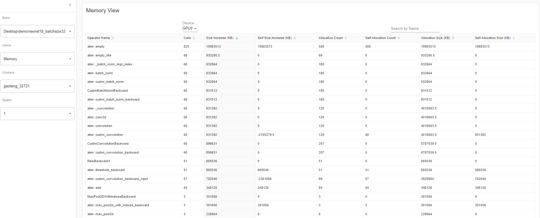 The profiler records all the memory allocation during the profiler interval. Selecting the “Device” will allow you to see each operator’s memory usage on the GPU side or host side. You must enable profile_memory=True to generate the below memory data as shown here.