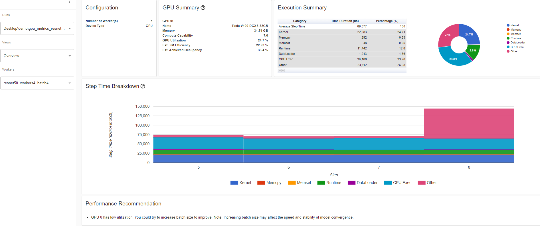 Looking of the overview page where the performance recommendation section is where you’ll find potential suggestions on how to increase that GPU utilization. In this example, GPU utilization is low so the performance recommendation was to increase batch size. Increasing batch size 4 to 32, as per the performance recommendation, increased the GPU Utilization by 60.68%.