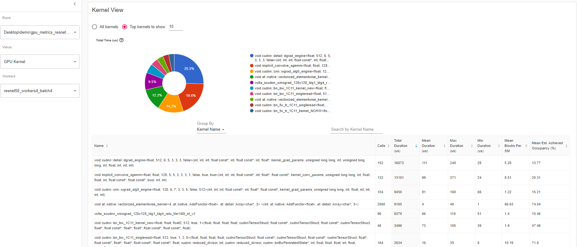 Kernel View The kernel has “Blocks per SM” and “Est. Achieved Occupancy” which is a great tool to compare model runs.