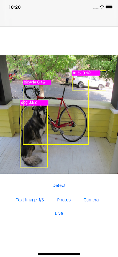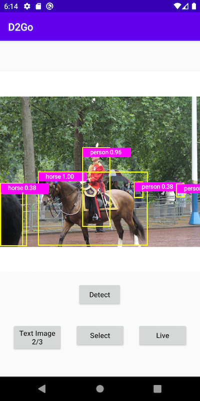 This app demonstrates how to create and use a much lighter and faster Facebook D2Go model to detect objects from pictures in your photos, taken with camera, or with live camera.