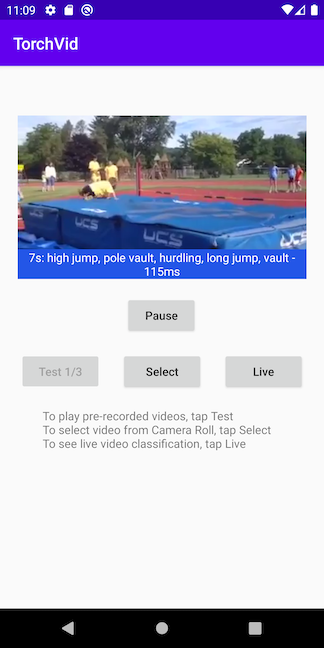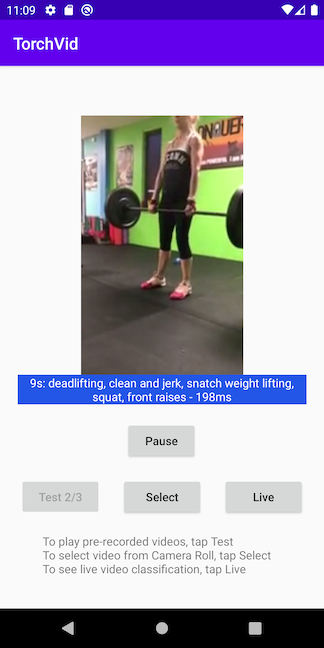 This app demonstrates how to use a pre-trained PyTorchVideo model to perform video classification on tested videos, videos from the Photos library, or even real-time videos.
