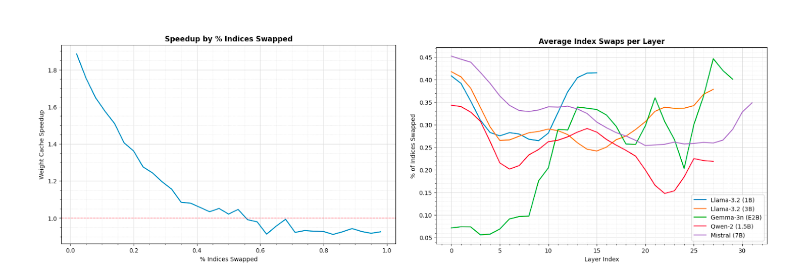 Figure 6: Overall speedup in MLP block operations as a function of index swaps per cache update. Right plot shows average index swaps for common models using sparsities derived from Fig 3.