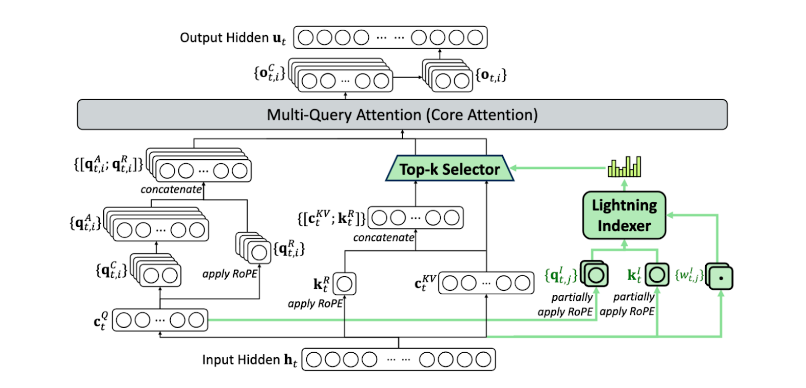 Figure 7: Architecture of Deepseek Sparse Attention (figure taken from DeepSeek-AI [2025])