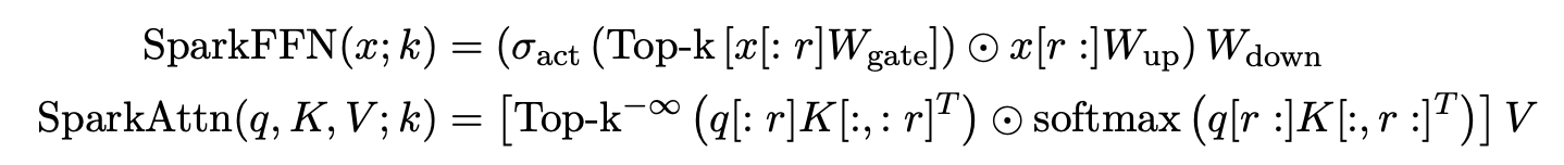 Spark Transformer proposes a different sparse predictor for both attention and feed‑forward layers. It partitions the input vectors into two segments: a small prefix used only to compute a top‑k mask, and the remainder used for the full computation. Their approach involves defining sparse operators “SparkAttention” and “SparkFFN”, which function somewhat similarly to the lightweight sparse predictors we have discussed previously.