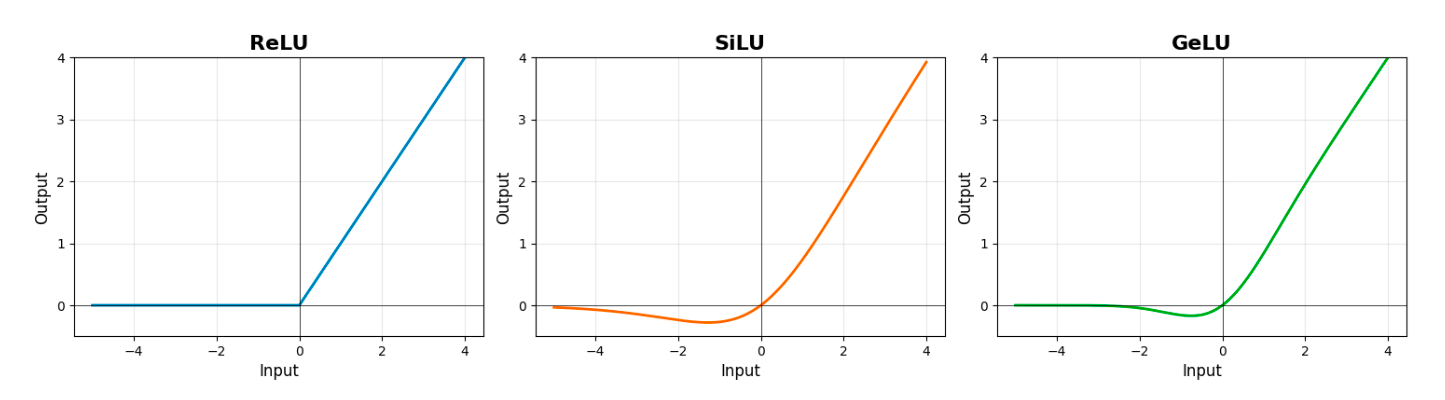 Figure 3: Plots of activation curves for ReLU, SiLU and GeLU.