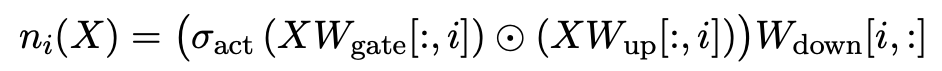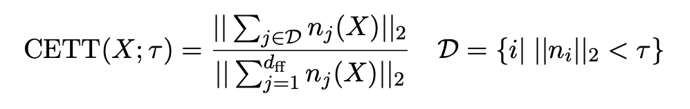 To address this, Zhang et al. proposed Cumulative Errors of Tail Truncation (CETT). For each neuron i, CETT computes the full contribution ni from that neuron — gate, up‑projection and down‑projection—and then chooses a threshold τ such that the L2‑norm of the neglected contributions remains below a target error budget. Fixing an “error budget” (e.g. allowing 20 % of the output norm to be dropped) yields a data‑dependent τ via binary search.