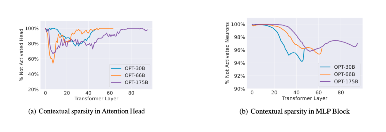 Figure 1: Observed sparsity in attention and MLP blocks of OPT models