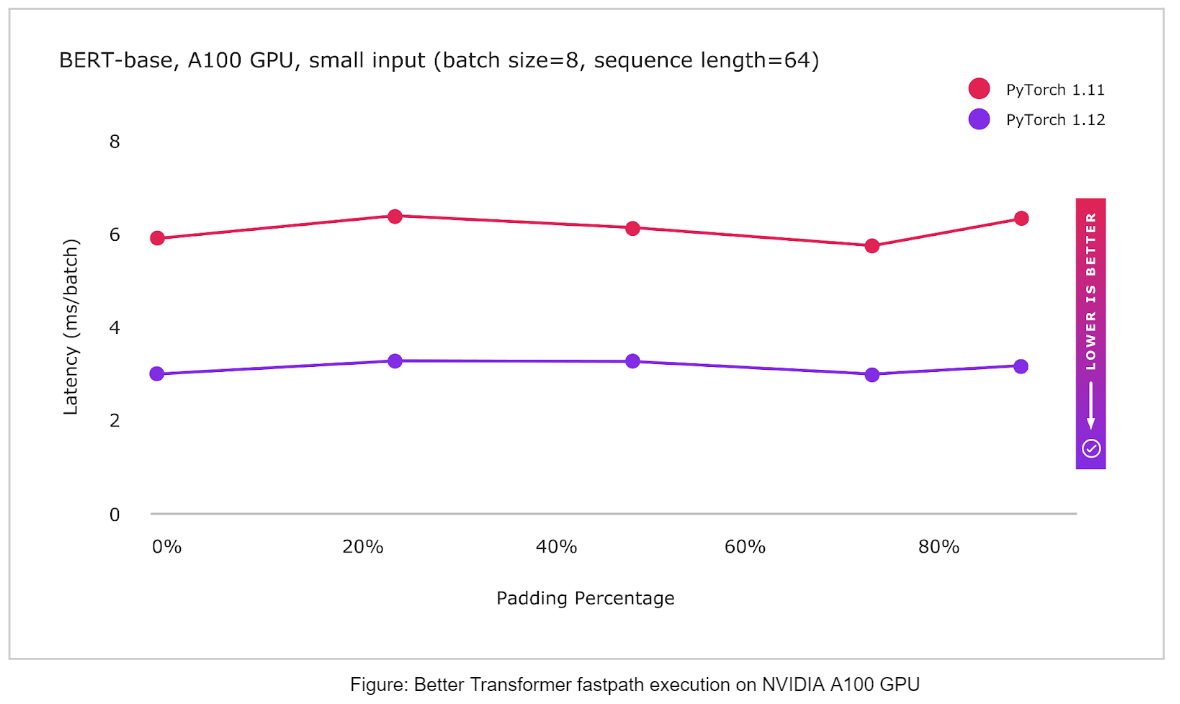 PyTorch now supports CPU and GPU fastpath implementations (“BetterTransformer”) for several Transformer Encoder modules including TransformerEncoder, TransformerEncoderLayer, and MultiHeadAttention (MHA). The BetterTransformer fastpath architecture Better Transformer is consistently faster – 2x for many common execution scenarios, depending on model and input characteristics. The new BetterTransformer-enabled modules are API compatible with previous releases of the PyTorch Transformer API and will accelerate existing models if they meet fastpath execution requirements, as well as read models trained with previous versions of PyTorch. PyTorch 1.12 includes: