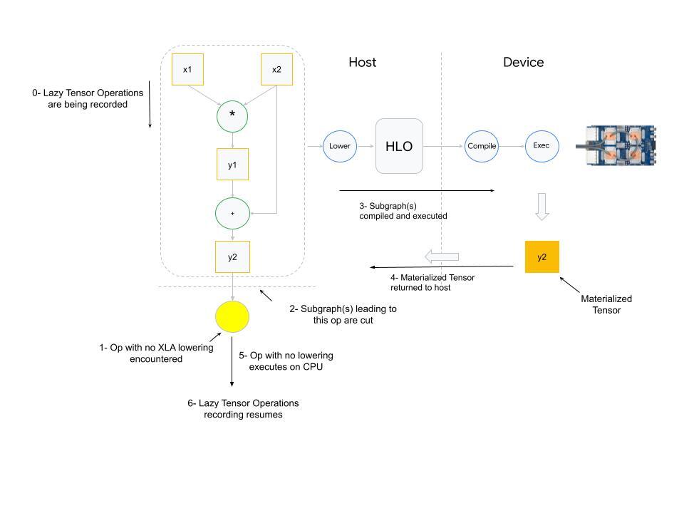 What happens when an op with no XLA lowering is used? PyTorch XLA stops the operation recording and cuts the graph(s) leading to the input(s) of the unlowered op. This cut graph is then compiled and dispatched for execution. The results (materialized tensor) of execution are sent back from device to host, the unlowered op is then executed on the host (cpu), and then downstream LazyTensor operations creating a new graph(s) until a barrier is encountered again.