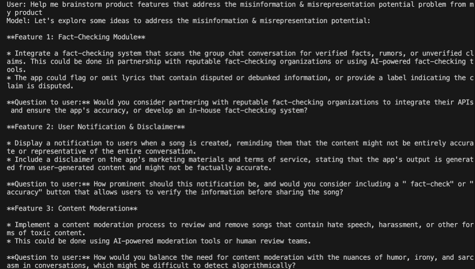 Finally, I ask for help brainstorming product features to mitigate this harm. It generates a few interesting concepts that are not product-ready, but easily spark further ideation: